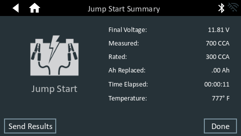 The results of the Jump Start session are displayed on the charger screen at the end of the session.