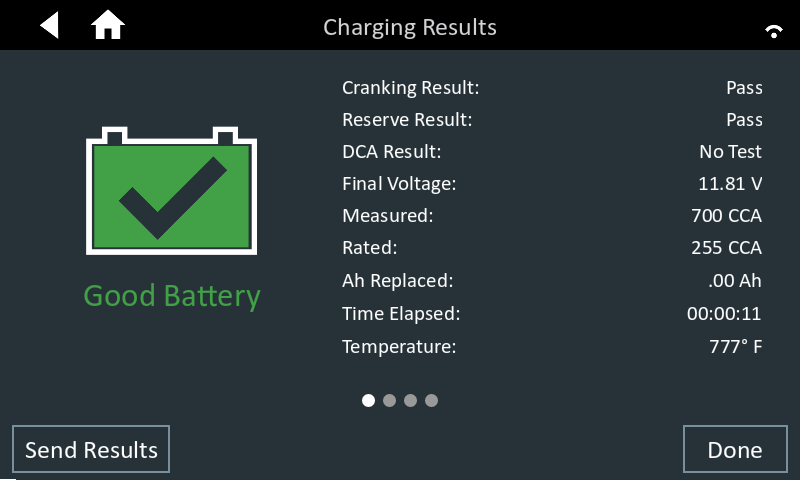 The test results are then displayed on the charger screen.