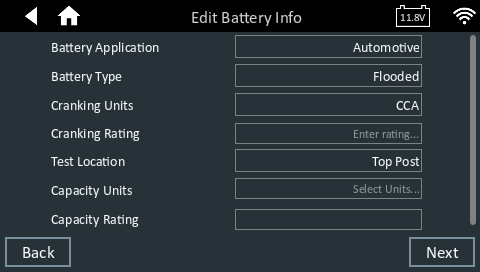 - At the Main Menu, tap Out of Vehicle Charge. The Edit Battery Information screen is displayed.